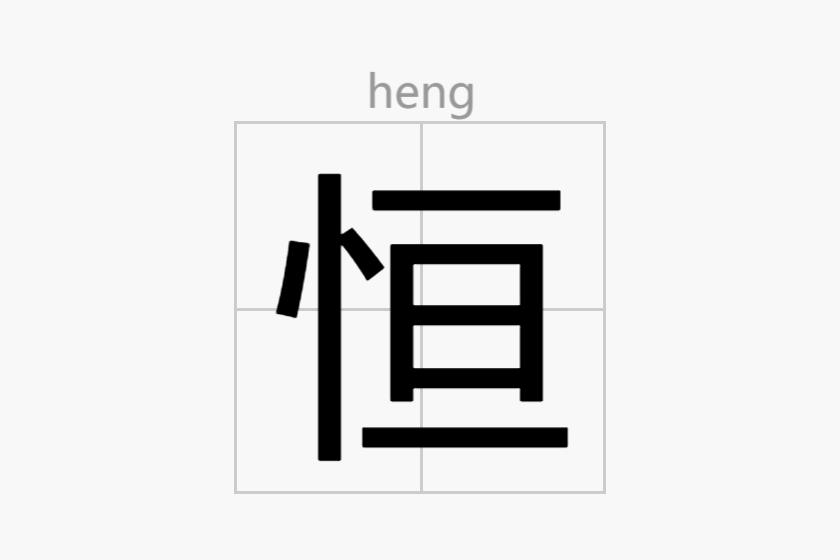 恒(拼音:héng、gèng),汉语一级通用汉字(常用字)。此字古字形写作“亘”,最早见于商代甲骨文。本义为上弦月渐趋盈满的样子,又通“亘(gèn)”指绵延,延续,读作gèng。月亮弦、望有常,故引申出长久、持久的意思;又引申特指恒心,用作名词;又引申为表示行为动作的经常性,用作副词。读héng。[1]