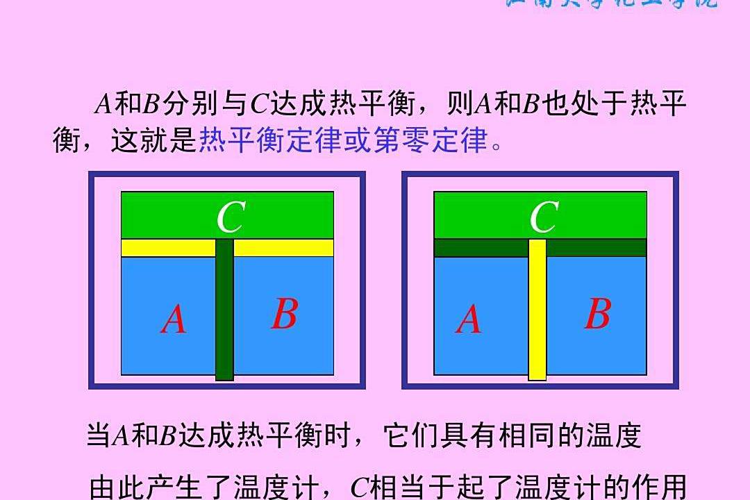 “若两个热力学系统均与第三个系统处于热平衡状态,此两个系统也必互相处于热平衡。”